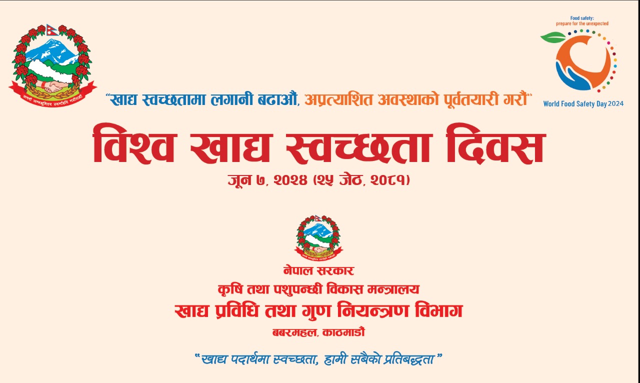 काठमाडौँ १८ जेठ खाद्य स्वच्छतामा लगानी बढाऔँ, अप्रत्याशित अवस्थाको पूर्व तयारी गरौँ” भन्ने नाराका साथ विश्व खाद्य स्वच्छता दिवस, २०८१ मनाउने तयारी भइरहेको खाद्य प्रविधि तथा गुण नियन्त्रण विभागले जनाएको...